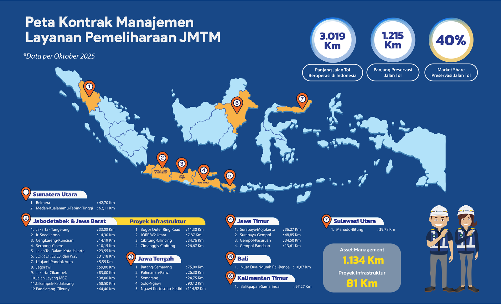 meliputi pekerjaan Scrapping Filling Overlay (SFO), pekerjaan rekonstruksi, pekerjaan penambahan lajur jalan, pekerjaan peningkatan kapasitas gerbang, pekerjaan renovasi gerbang tol, penanganan longsoran, perbaikan jembatan, pekerjaan lanskap, pekerjaan beautifikasi, pekerjaan pemasangan dan/atau penggantian lampu PJU, serta pekerjaan pengecatan marka jalan.